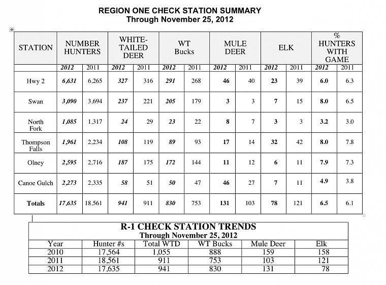 Hunters checked 10 percent more whitetail bucks, 27 percent more mule deer, and 36 percent fewer elk as compared to last year. The number of hunters in northwest Montana was down five percent. The reduction in elk checked through the stations could be partly due to the lack of a youth antlerless opportunity this hunting season