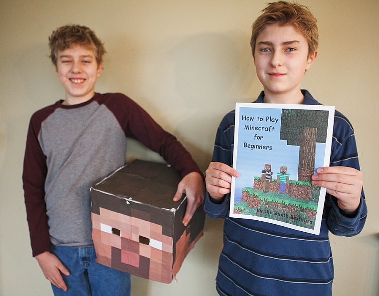 Patrick Cote/Daily Inter Lake Eric, right, holds a picture of the cover of the book he and his brother Andrew wrote about the basics of playing the popular computer game Minecraft. Tuesday, Nov. 27, 2012 in Kalispell, Montana.