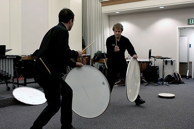 Members of the University of Montana's Percussion Ensemble dual with drum heads during a comedic piece entitled "Heads Up."