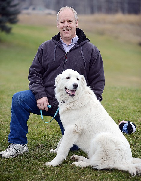 Brenda Ahearn/Daily Inter Lake David Marion with Ace, one of the Great Pyrenees from the film Santa Paws2: The Santa Pups, on Wednesday, November 28, at A Country Animal Hospital in Eureka. Ace is now 16 months old and weighs 125 pounds. According to Marion, he's still growing.