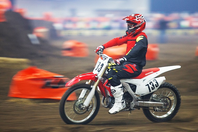 Patrick Cote/Daily Inter Lake James Armstrong races around the track in the 450cc intermediate class heat Friday night during Arena Cross at the Majestic Valley Arena. Friday, Nov. 30, 2012 in Kalispell, Montana.