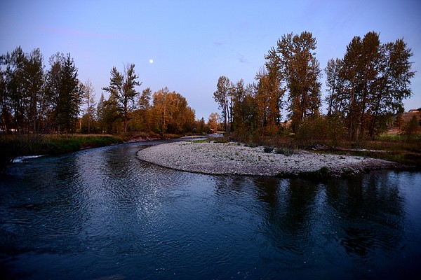 A near full moon sets over the Stillwater River at dawn on Monday, October 1, in Evergreen.