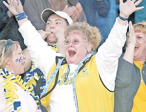 Kathy Jenkins jumps for joy as Danny Leggins finds the end zone in second quarter vs. Frenchtown 10-3-12