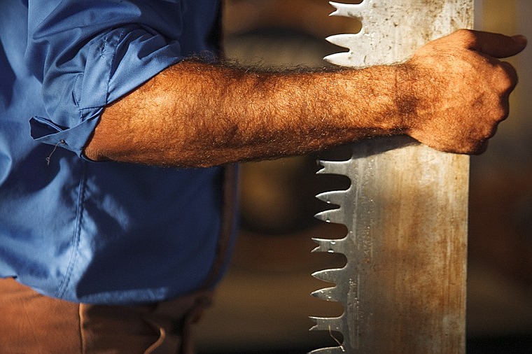 Patrick Cote/Daily Inter Lake Scott Skerlock holds the saw for the log-sawing contest Thursday night during Oktoberfest at Depot Park in Whitefish. Thursday, Sept. 27, 2012 in Whitefish, Montana.