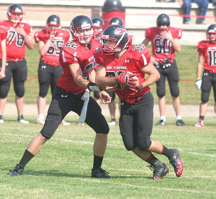 HAND-OFF: Savage Heat sophomore QB Tanner Hoff keeps his eye out for defenders as he gives the ball to senior RB superstar Mike Gray for a 35 -yard carry to a touchdown.