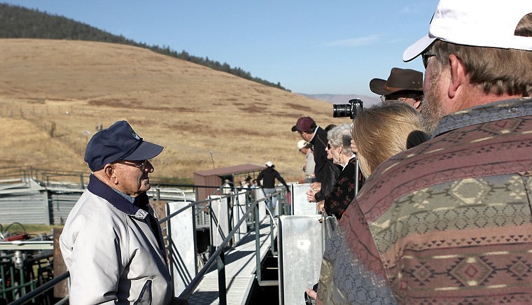 A Backcountry Horsemen volunteer chats with spectators at the Bison Roundup on Monday.