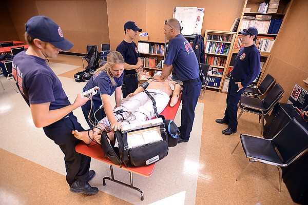 From left, Firefighter/EMTs Brandon French, Jessica Kinzer, Doug Schwartz, Tim Gaston, and Josiah Mooney practice various medical scenarios as they prepare for their Advanced Cardiac Life Support recertification. EMTs are required to recertify every two years. Fire Prevention Week started on Sunday, October 7, and goes through the 13th. During this week the fire department will give a fire presentation to all third grade classes in the city including at Trinity Lutheran and St. Matthew's, they will be going door-to-door with information packets for residents in the south end of town, and they will be giving multiple station tours. To request a station tour call 758-7760.