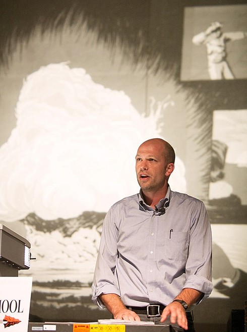 Patrick Cote/Daily Inter Lake Jonathan Fetle-Vorm presents his graphic novel "Trinity" to a group of students Tuesday afternoon at Flathead High School. Fetle-Vorm's novel details the history of the atomic bomb. Tuesday, Oct. 2, 2012 in Kalispell, Montana.