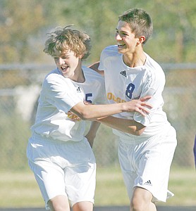 Midfielder Juan Rios, right, gets congrats from Johnny Davidson for scoring in the first half vs. Polson 10-4-12.