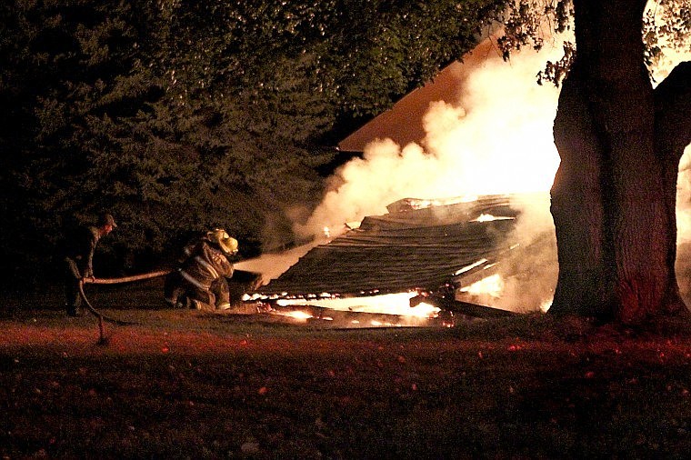 Superior Volunteer Firefighters work to contain a fire that erupted late Sunday night. The fir started in an empty woodshed.