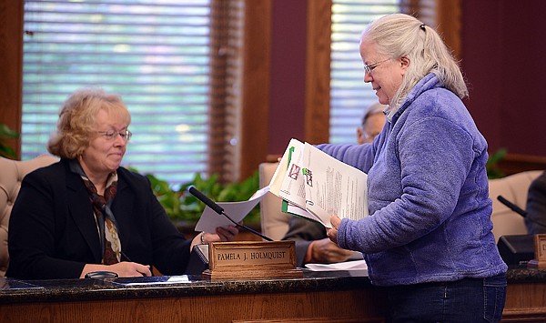 Mayre Flowers, Executive Director of Citizens for a Better Flathead hands out a response to a letter from the Montana Environmental Consultants Association regarding revisions to the growth policy to the Pam Holmquist and the other County Commissioners on Thursday morning, October 11, in Kalispell.