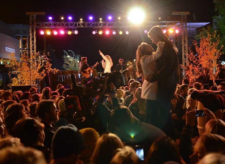 “Bachelor” Sean Lowe delivers a kiss to his date Lindsay Yenter after they arrived for country music singer Sarah Darling’s concert on Central Avenue in Whitefish Wednesday night. Lowe is the star of the 17th season of “The Bachelor,” which will air on ABC starting in January. The show matches Lowe with 24 eligible women, one of whom might end up engaged to him by the end of the season. Yenter and Lowe were definitely enjoying themselves Wednesday as part of a two-day visit to Whitefish by Lowe and the remaining contestants. On the agenda were dinners at several local restaurants and a trip to Glacier National Park. Yenter was holding a rose when she arrived at the concert, which means she was assured of at least one more week on the show.