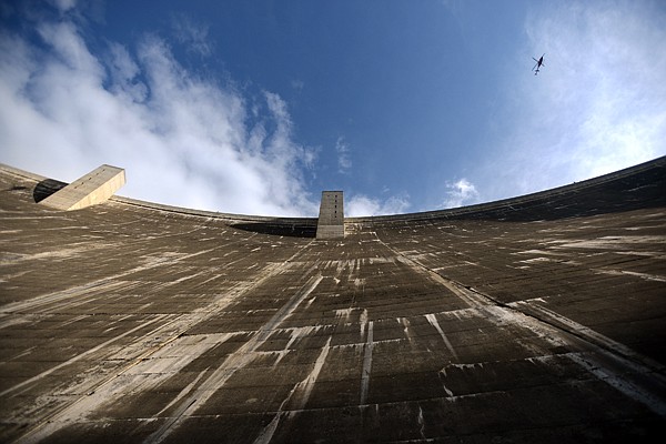 The ALERT helicopter flies over Hungry Horse Dam on Friday afternoon as it returns to Kalispell Regional Medical Center from a call in Essex.