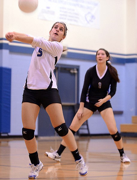 Stillwater sophomore Sophie George (5) receives a serve during their game against Flathead JV on Tuesday, October 16, in Kalispell.