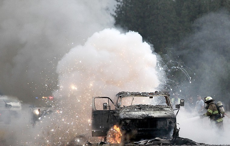A Superior Volunteer Firefighter douses a vehicle with a combination of water and foam as it erupts in sparks on the westbound side of Interstate 90 Friday.
