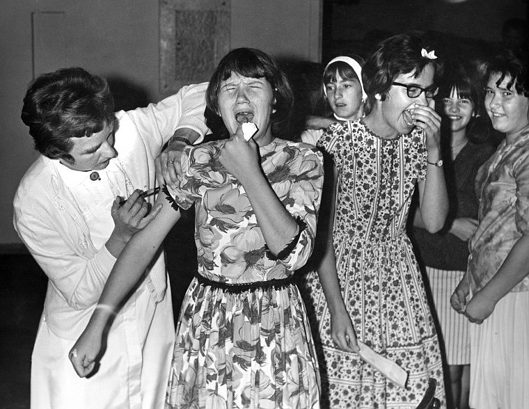An unidentified Central School student gets a vaccination, while classmate Andrea Paul, right, laughs at her reaction. In the back left, Marilyn (Rauthe) Driscoll, Renae Heinrichson and Vicki Ulrich, far right, look on. The nurse is also unidentified.