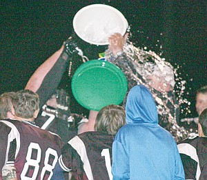 Assistant Coach Dallas Carr gets a dousing post game Friday.