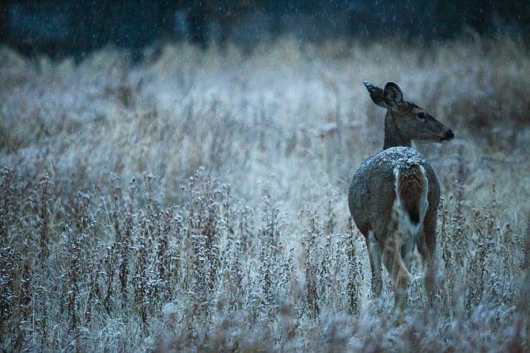 A whitetail doe pauses for a moment while walking through the first snow of the winter Monday night at Smith Lake. Monday, Oct. 22, 2012 in Smith Lake, Montana.