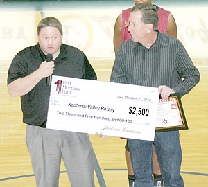 First Montana Bank President Jackson Garrison presents a $2,500 check to Rotary President Darren Coldwell.