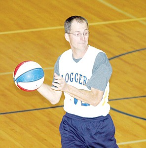 Rotary Roundballer Wally Winslow passes to Creede Garcia in third quarter action.