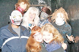 Shanda Jennings and Cindy Curtiss are scared by members of the Kootenai Karacters. The group will host a haunted house in DeShazer Realty’s basement this weekend.
