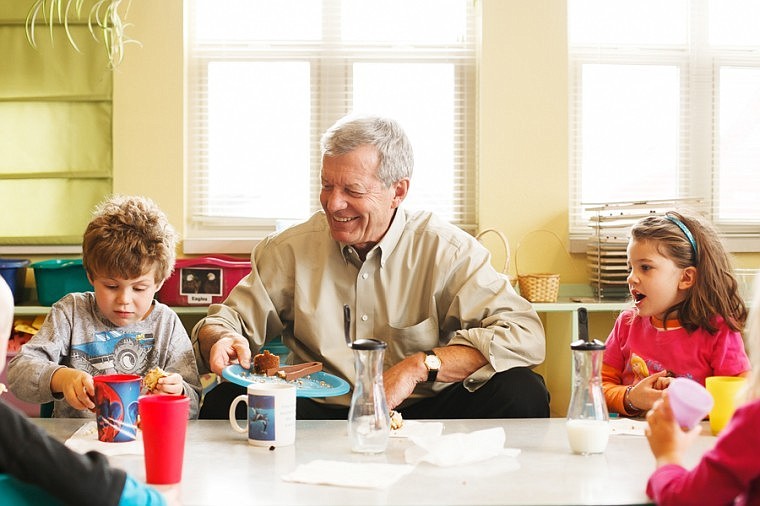 Sen. Max Baucus serves muffins to students Morgan Guffin, 5, and Sarah Espinoza, 4, Tuesday afternoon during snack time at Discovery Developmental Center in Kalispell.