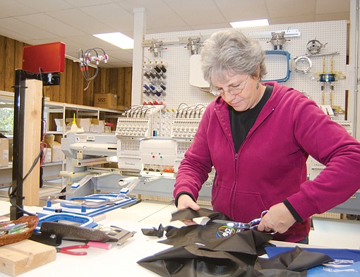 The digital file Corporate Image receives for a logo is converted to a sewing machine program. Embroidery is three-dimensional, Upton explained, and fabrics have special properties that affect the process. A completed logo may have 5,000 to 7,000 stitches.