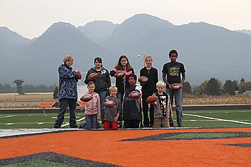 Ronan participants in the Sectional Punt, Pass, and Kick competition flash some pigskin on the Chiefs’ home field. In the back row, from left to right, are Dylan McLeod, Chenoa Wander, Micalann McCrea, Veyanna Curley and Kuba Detwiler. In the front row, from left to right, are Maggi Lake, Colter Cornwell, Davonte Clark-Gardiner and Daniel Bishop. The Ronan contingent featured three first-place winners who came out on top of other youngsters from Western Montana at the Oct. 7 exhibition in Missoula. Taking top honors in the 8-9 year-old girls’ division was Adriana Tatukivei (not pictured), while Karalani Tatukivei (not pictured) paced the 10-11 year-old girls. Micalann McCrea reclaimed her crown as the region’s top dog in the 12-13 year-old girls’ bracket, racking up a combined distance of 258’5”. McCrea has a good chance of qualifying for the regional championship, held at the home of the Seattle Seahawks on Dec. 8. In 2010, McCrea also advanced to the Seattle showdown, where she went on to claim the Seahawks regional title for her division. Historically, Western Montana has been well-represented at the events, as a press release states that, “Western Montana garnered three individual championships in Seattle in 2010 and two last year.”
