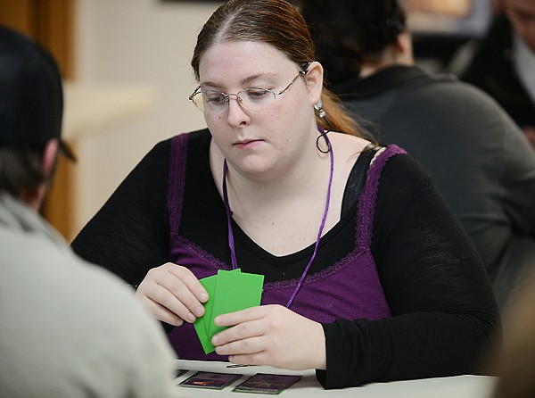 Alisha Young of Kalispell watches as she waits for her turn during a round of Magic in the tournament on Saturday, October 27, at Heroic Realms in Evergreen.