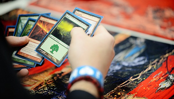Eric Haegele of Kalispell shuffles through his cards as he plays Magic in the tournament on Oct. 27 at Heroic Realms in Evergreen.