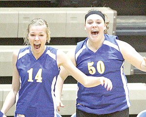 Lauren Wepprecht, left, and Dalyn Germany react as the Lady Loggers defeat the Lady Pirates in the last conference game Friday at Ralph Tate Gymnasium. 22-25, 25-16, 17-25, 25-18, 15-6