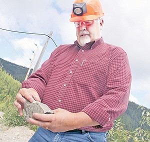 Revett Chairman Tim Lindsey inspects a rock with copper ore outside the mine opening.