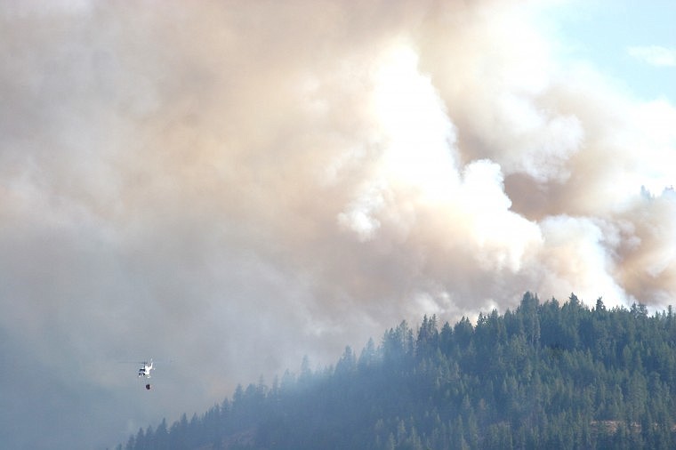 The helicopter flies back towards the river after dumping water on the blaze Sunday afternoon.