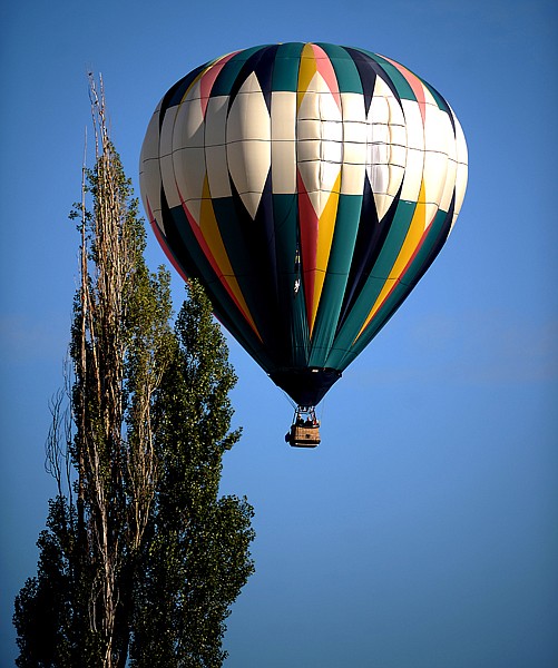 Paul Fifield of Fantasy Flights decides he cannot land in the field he was aiming for an increases the hot air to rise again over the tree tops on Tuesday, September 4, east of Kalispell.