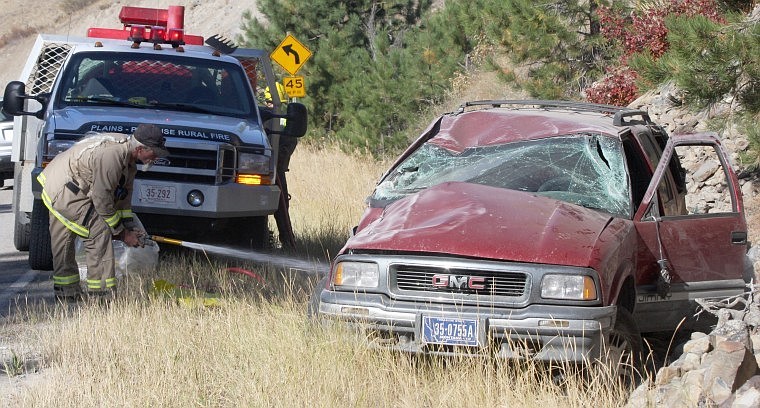 Plains-Paradise Rural Fire District Lt. Pat Irving, tends to the rollover, hosing the vehicle off.