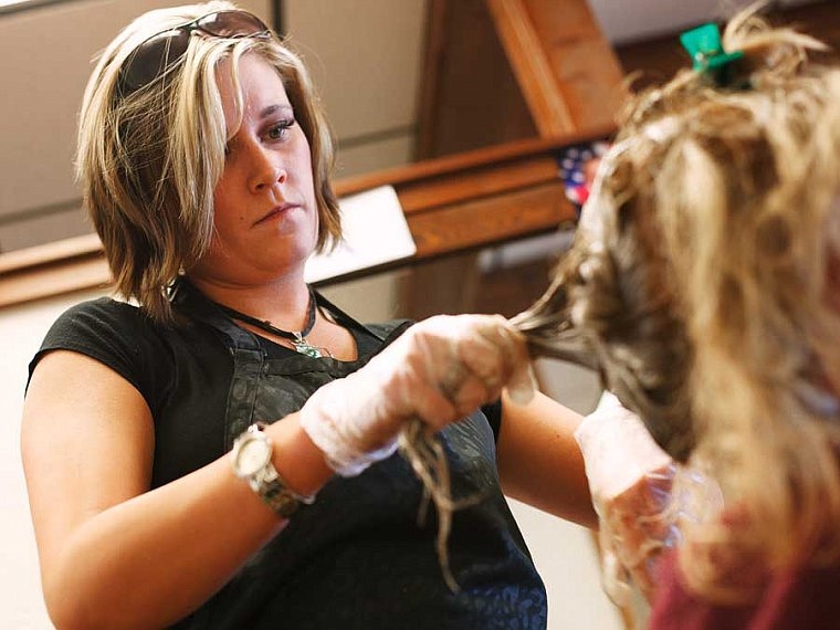 Patrick Cote/Daily Inter Lake Aria Halliday, left, colors the hair of David Critzer Monday afternoon at Crevier's Academy of Cosmetology Arts in Kalispell. Monday, Sept. 10, 2012 in Local, Montana.