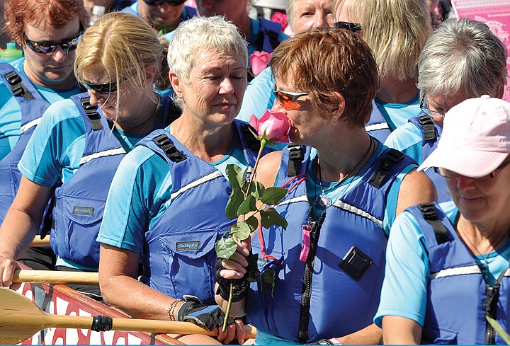 The roses were thrown by three of the 56 teams that participated in the first Montana Dragon Boat Festival, Abreast in the Rockies from Cranbrook, British Columbia, Pink Phurree from Houston, Texas, and Sister Power from Medicine Hat, Alberta.
