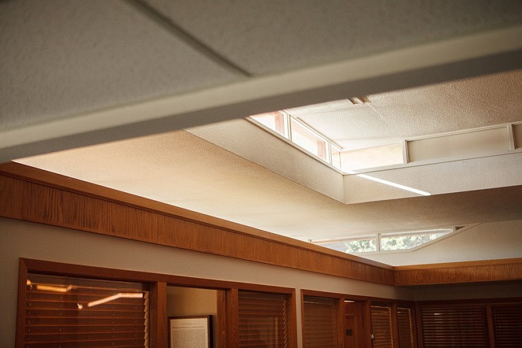 Natural light filled the original interior through a double clerestory window and 64-feet-long wall of floor-to-ceiling glass facing west. Part of Wright’s original design called for a landscaped garden of low bushes and perennials where a parking area now is located.