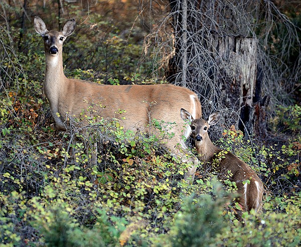 A deer and fawn forage for breakfast north of Kalispell on Tuesday morning, September 18.