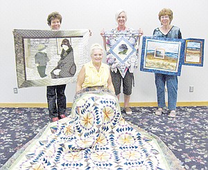The top quilters in the Kootenai Valley Quilt Guild include Jan Sanderson with her third-place quilt. In the back row, from left, are Becky Brundin, with her entry entitled “Little Bobbie,” sewn from an 80-plus-year-old photograph of her father; Glena Hook with “Morning Dew,” which won third place among Wall-Hangings, and Carrie Gehrke, whose second-place entry represents a scene from her honeymoon. Second-place winner in the Quilt category Nora LaFrance is not pictured.