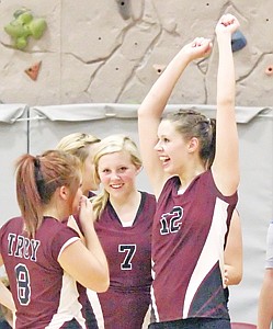 Marcy Kroschel, left, Taylor Brown and Michaela Curry react after defeating Libby in four games Tuesday night.
