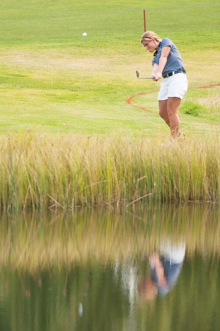 Glacier’s Teigan Avery chips over the water on the 11th hole Saturday morning during the Flatfish Invitational golf tournament at Buffalo HIll Golf Club.