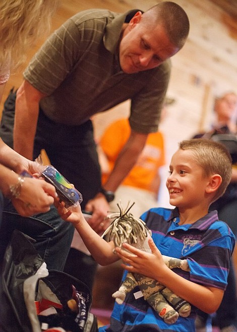 Patrick Cote/Daily Inter Lake Gabe Nelson, 8, right, shows the contents of his "Hero Packs" to his parents Kate and Eric on Saturday afternoon during the Yellow Ribbon Ceremony at the Red Lion in Kalispell. Eric, a member of the Montana Army National Guard Unit 495, will be deploying to Afghanistan in November. Children of National Guard and U.S. Army Reserve service members received the "Hero Packs" put together by Adopt A Troop and "Operation: Military Kids." Saturday, Sept. 22, 2012 in Kalispell, Montana.