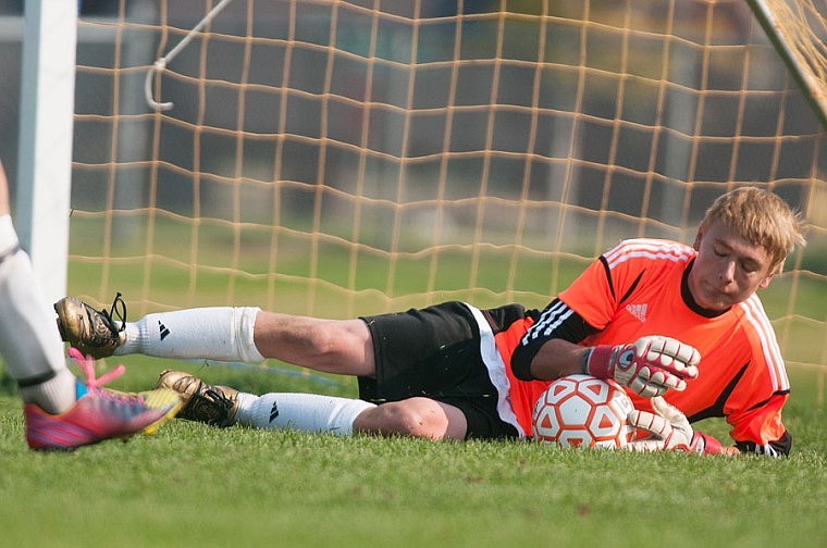 Flathead Braves goal keeper Clark Seaman makes a diving save Monday afternoon during Western AA soccer action with Missoula Big Sky at Kidsports Complex.
