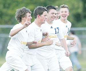 Johnny Davidson, left, Adam Neisess, Jared Laveway and Zander Peterson celebrate after Adam scores vs Bigfork 9-20-12 (Davidson assisted)