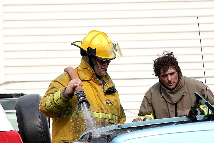 Superior Volunteer Firefighters Robert Ireland and Donald Mellen work to halt a fire in the engine compartment of a car Saturday.