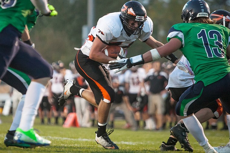 Flathead senior running back Austin Root (center) eyes the goal line Friday night during the sixth crosstown matchup at Legends Stadium.