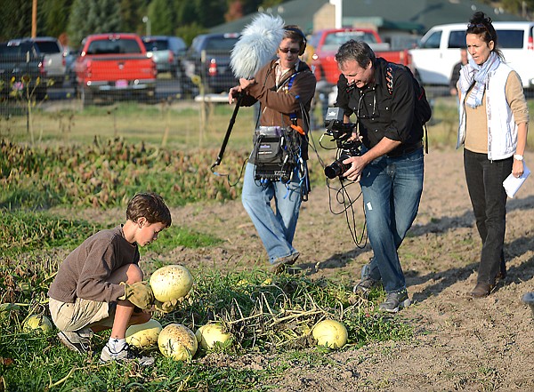 A film crew hired by Lions Club International gets footage as seventh-graders gather around Greg Schaeffer to get instructions before gathering garden produce on Wednesday.