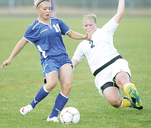 Sophomore defensive back Breanna Opland dives in an attempt to break up Hailey Purdy's shot on goal Tuesday vs. C-Falls.