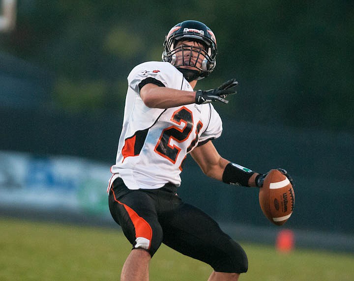 Patrick Cote/Daily Inter Lake Flathead senior wide receiver Kevin Grosswiler (21) throws the ball Friday night during the sixth crosstown matchup at Legends Stadium. Friday, Sept. 28, 2012 in Kalispell, Montana.